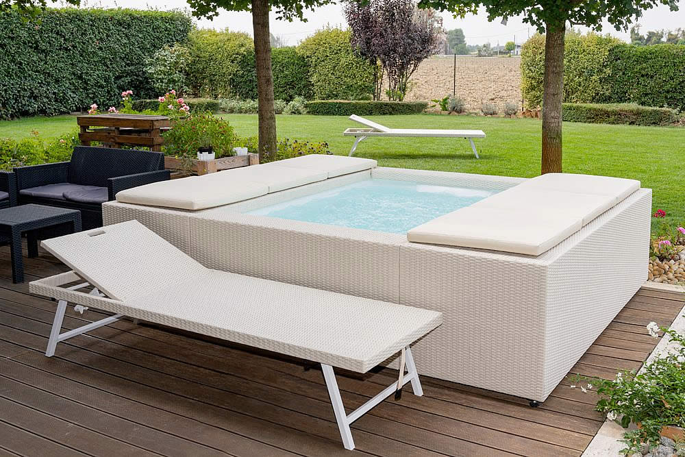 Puede ir equipadas, como opcional, por el cojín Playa Twin que convierte el producto en un verdadero mueble para exterior. El cojín Playa Twin se puede colocar encima de las dos salas técnicas para tomar el sol al borde de la piscina, o bien para completar la tumbona relax volviéndola aún más acogedora.
