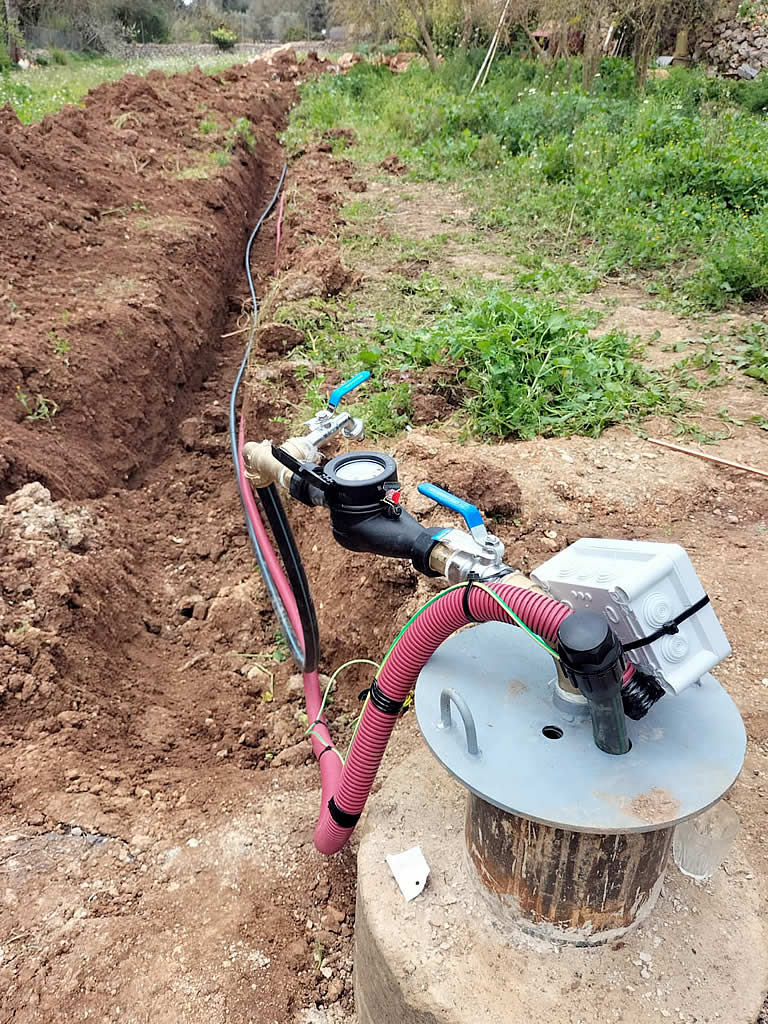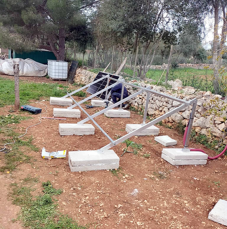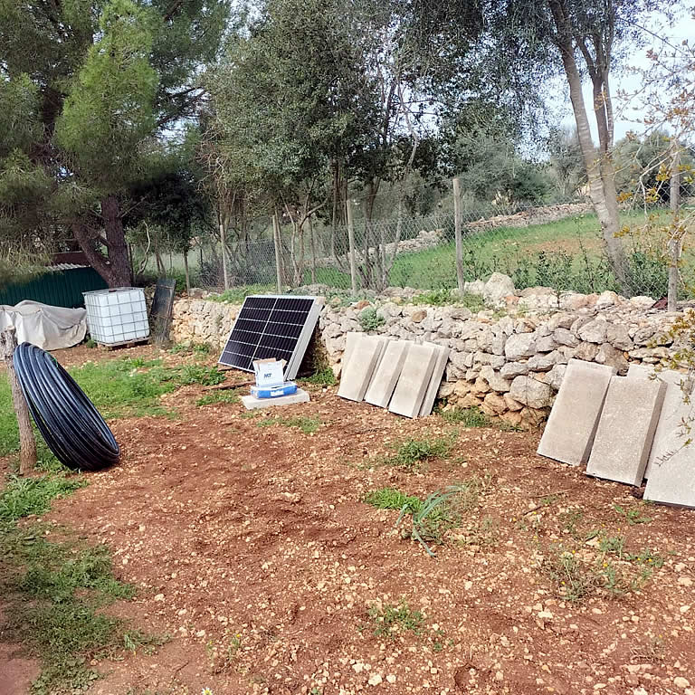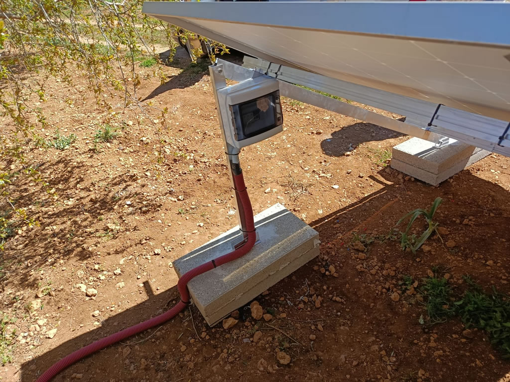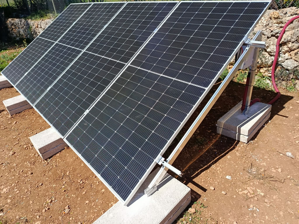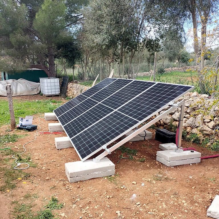 Instalación para riego solar en Costitx para 70 metros de profundidad, usando 4 placas solares de 550 W y una bomba solar HSB 1000 W