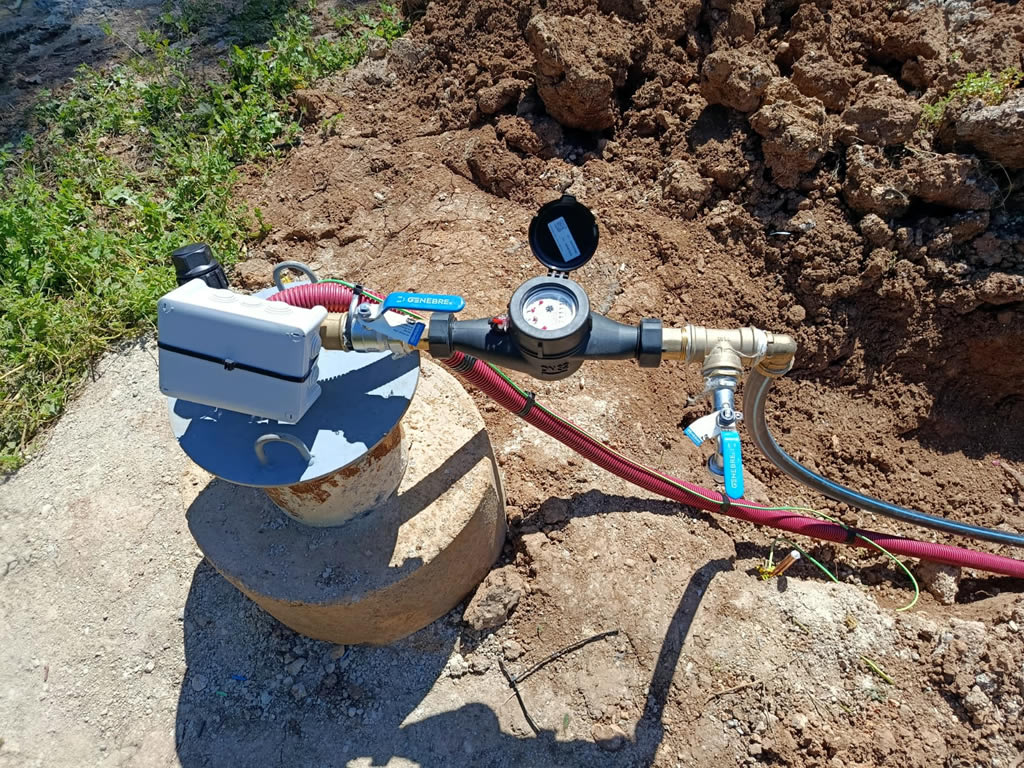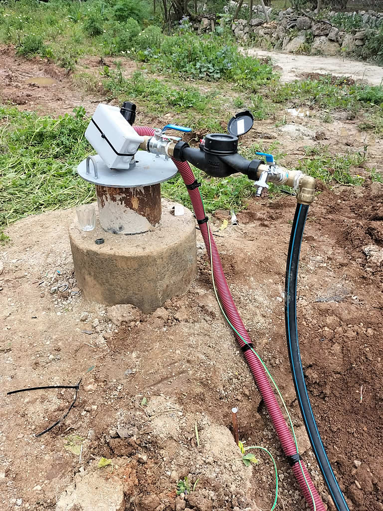 - La bomba solar HSB de 1000 W recibe la corriente continua y comienza a funcionar, extrayendo agua del pozo