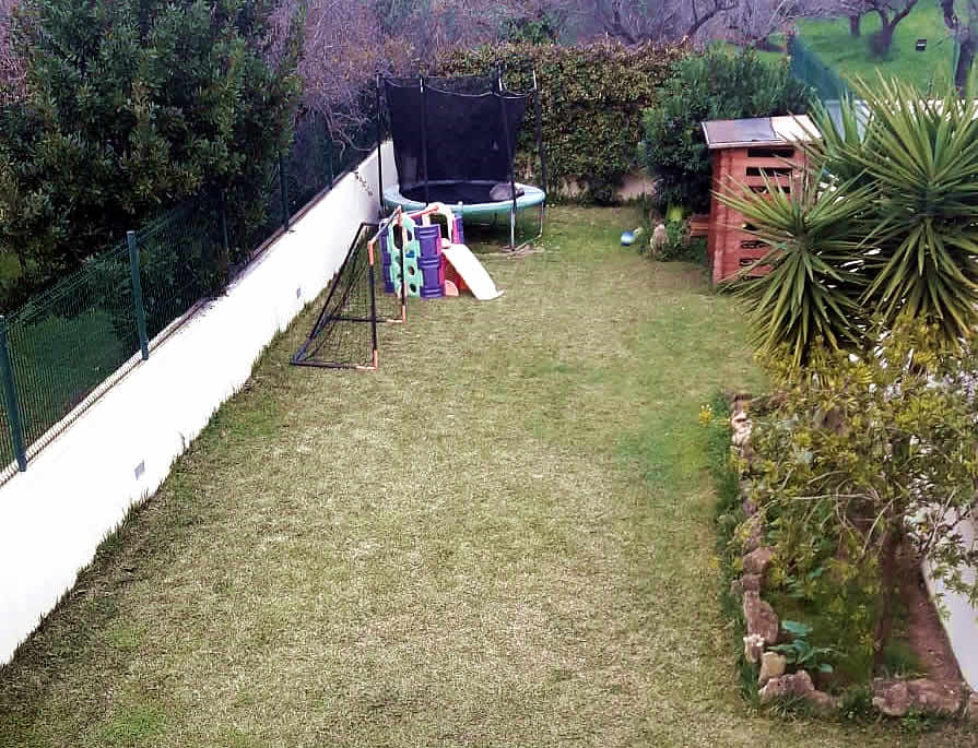 Instalación de piscinas de fibra unique 7 color beige con baldosa perimetral integrada con la piscina, local técnico elevado y electrolisis salina, en Campanet
