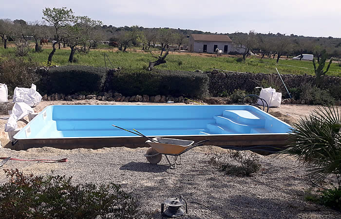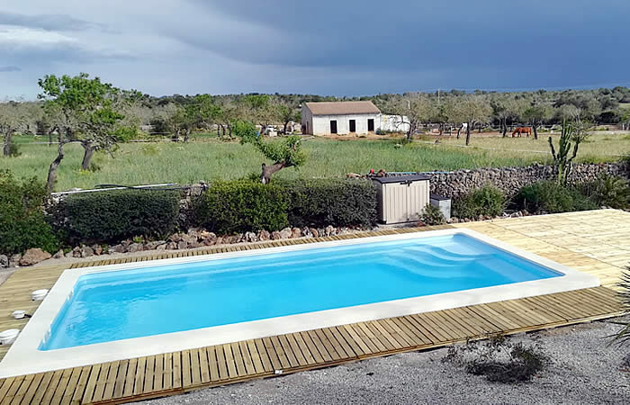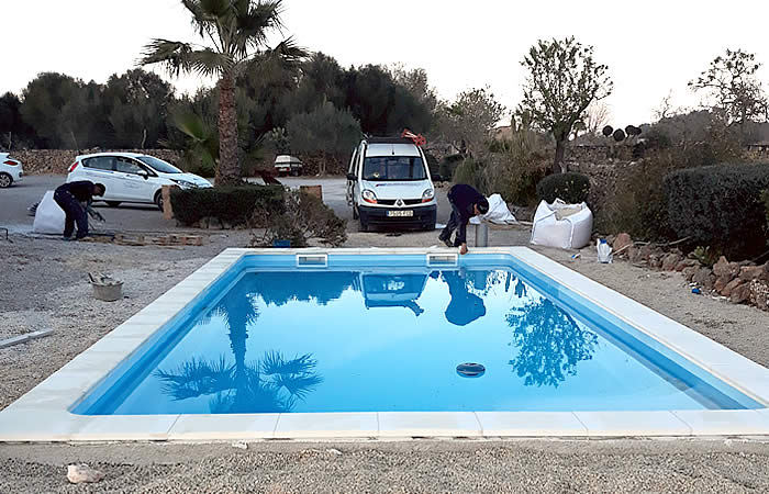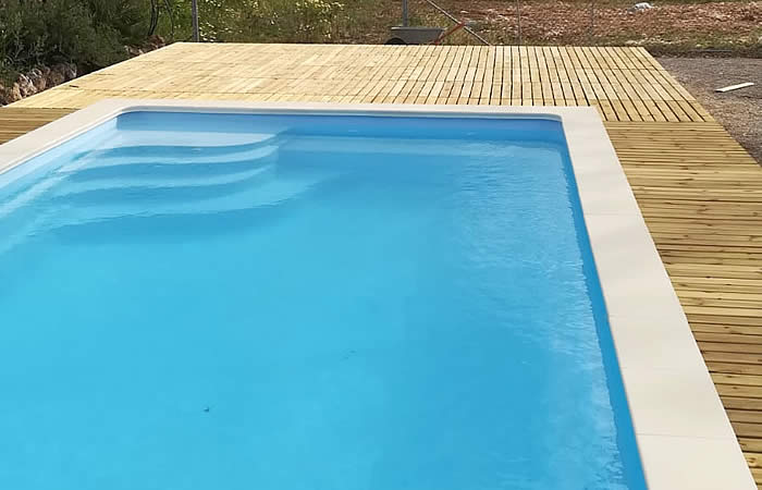 Home » proyectos » piscinas » Piscina de fibra Unique 8 con acabado perimetral de grava y tarima de madera
