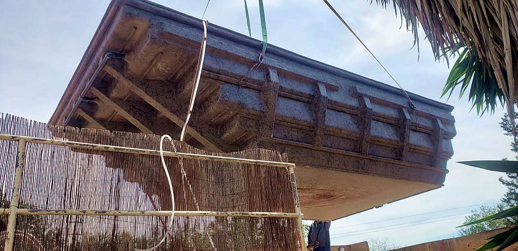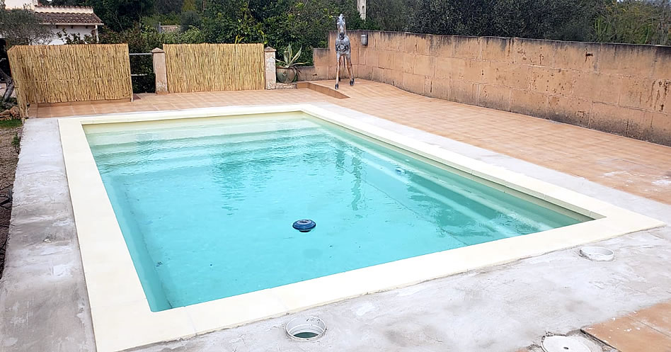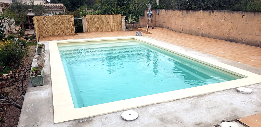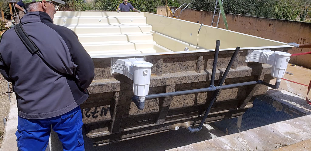 La instalación consistió en primer lugar cubrir el desnivel de la piscina de obra, mediante relleno con restos de obra, posteriormente se instaló la piscina con relleno de grava en los espacios entre la antigua piscina de obra y la nueva de fibra, para a continuación realizar la conexión de la instalación al sistema de filtración, el cual se pudo aprovechar y finalmente hacer de nuevo la coronación de la piscina con la piedra escogida por el cliente. La piscina quedo en funcionamiento en el plazo de tres días.