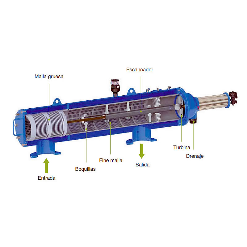 Con sus áreas de mallas variadas, los modelos M100 y MG soportan caudales de hasta 800 m³/h (3,520 gpm), con grados de filtración de 500 hasta 80 micrones y diámetros de entrada/salida de 2”-14”.
